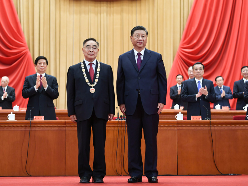 栗戰書宣讀習近平簽署的中華人民共和國主席令。主席令指出,為了隆重表彰在抗擊新冠肺炎疫情斗爭中作出杰出貢獻的功勛模范人物,弘揚他們忠誠、擔當、奉獻的崇高品質,根據第十三屆全國人民代表大會常務委員會第二十一次會議的決定,授予鐘南山“共和國勛章”,授予張伯禮、張定宇、陳薇“人民英雄”國家榮譽稱號。